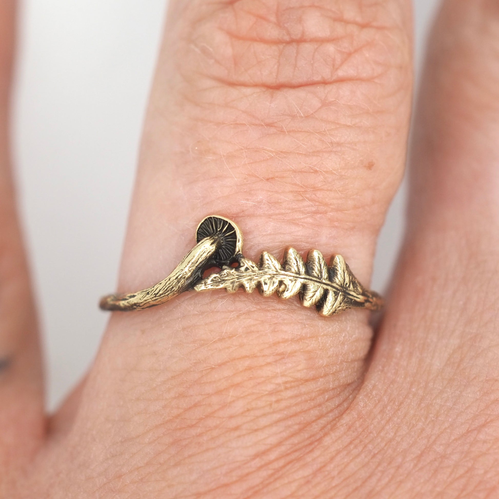 Twig and fern ring crafted from 14k yellow gold with a mushroom