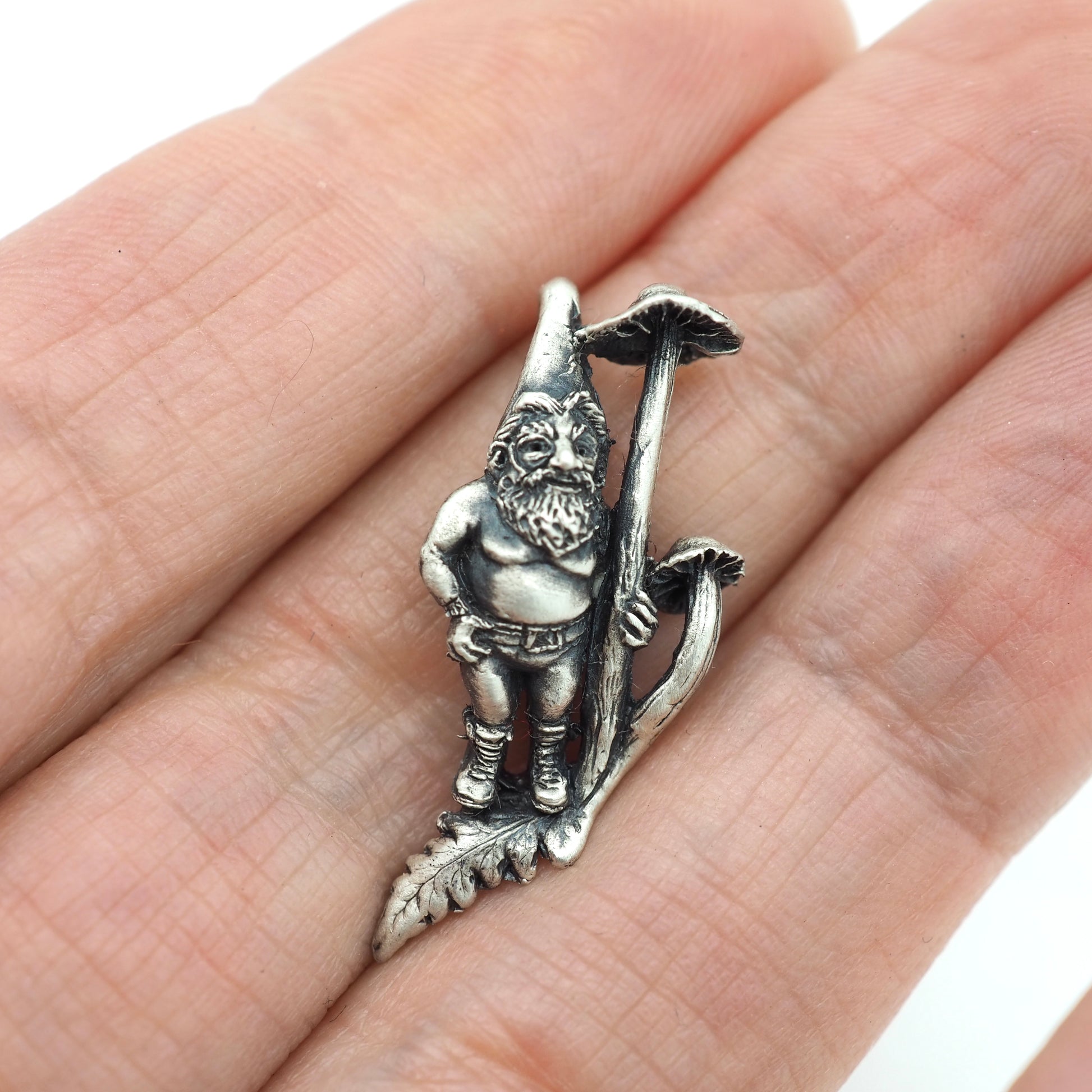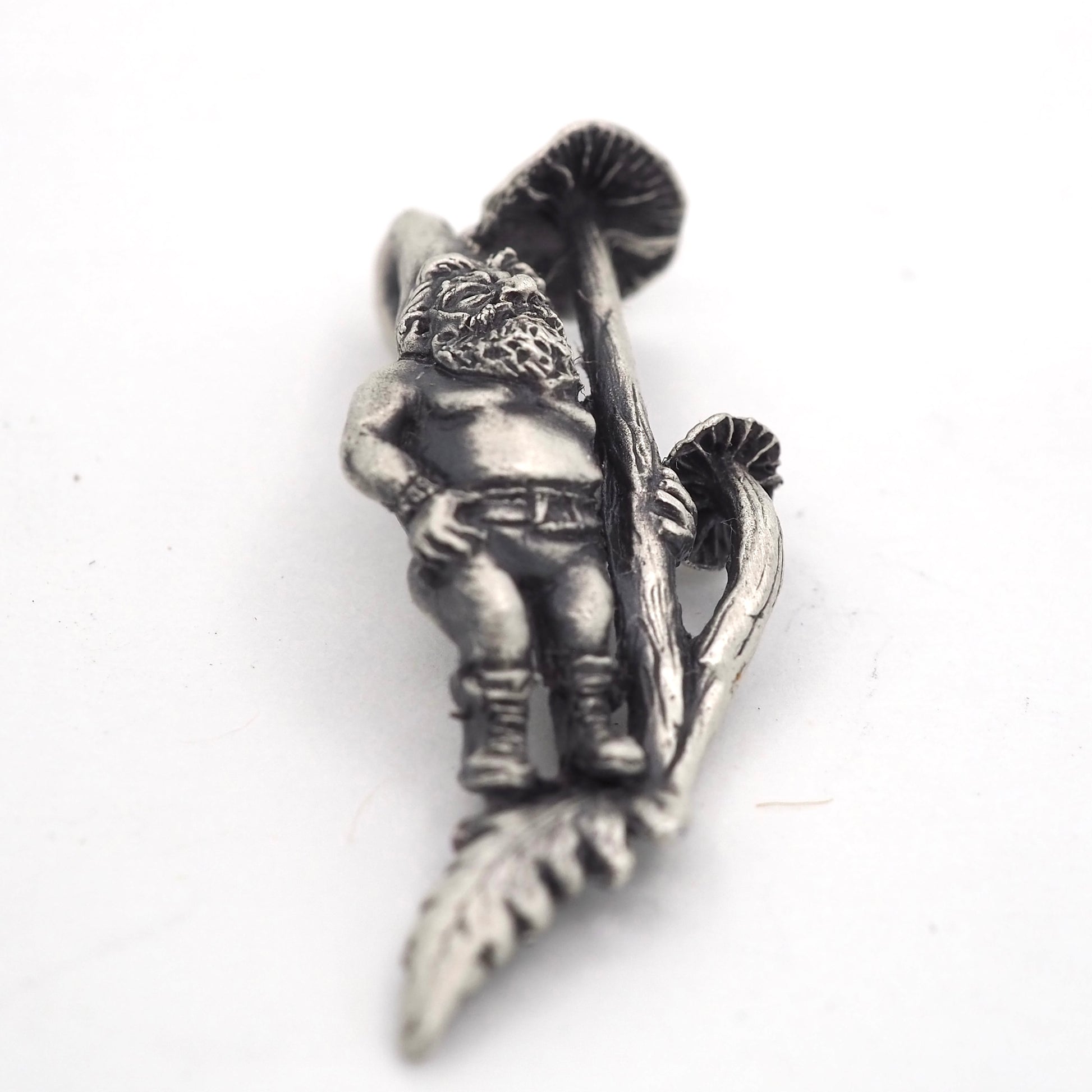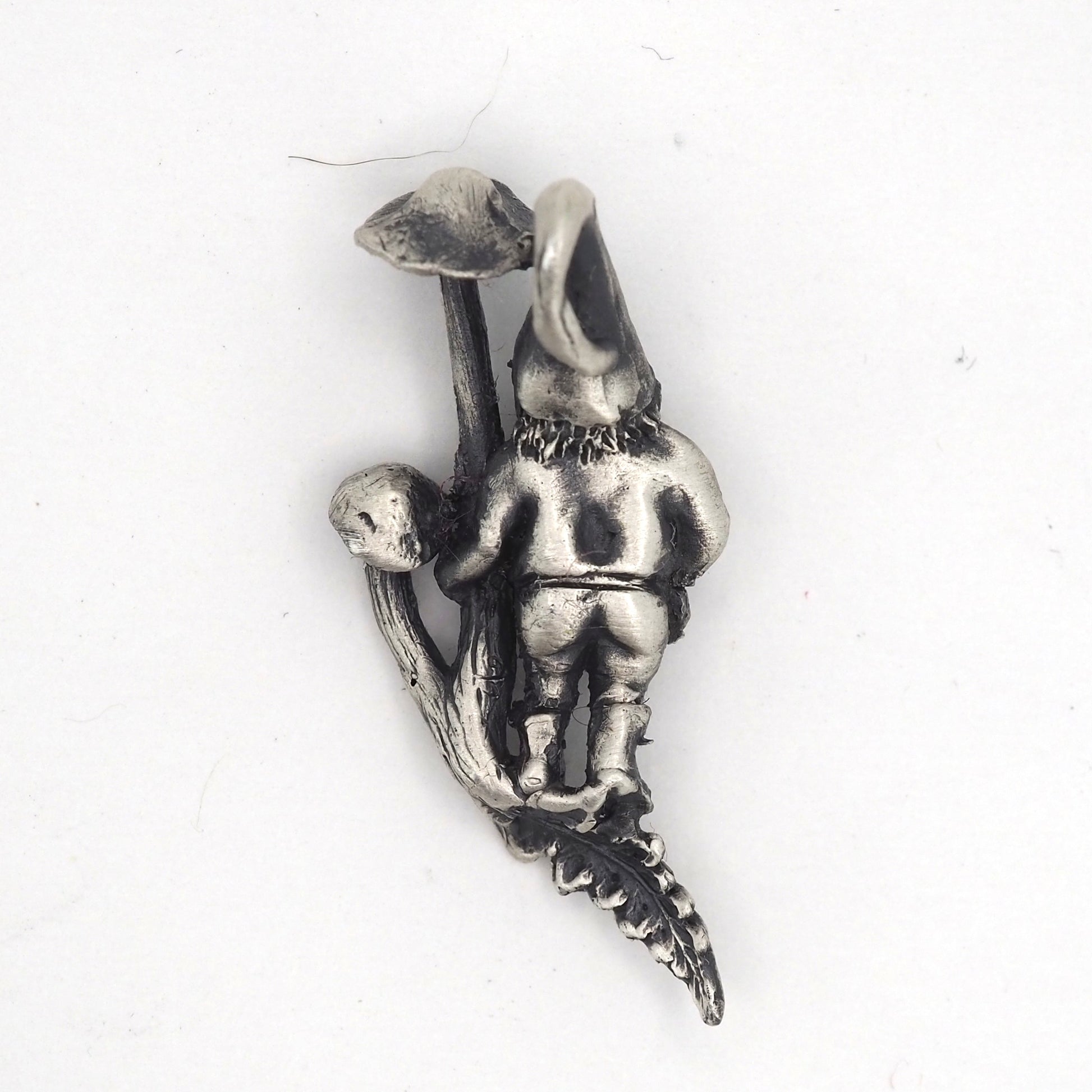 Little silver gnome with mushrooms and ferns. In a 20” sterling rolo chain