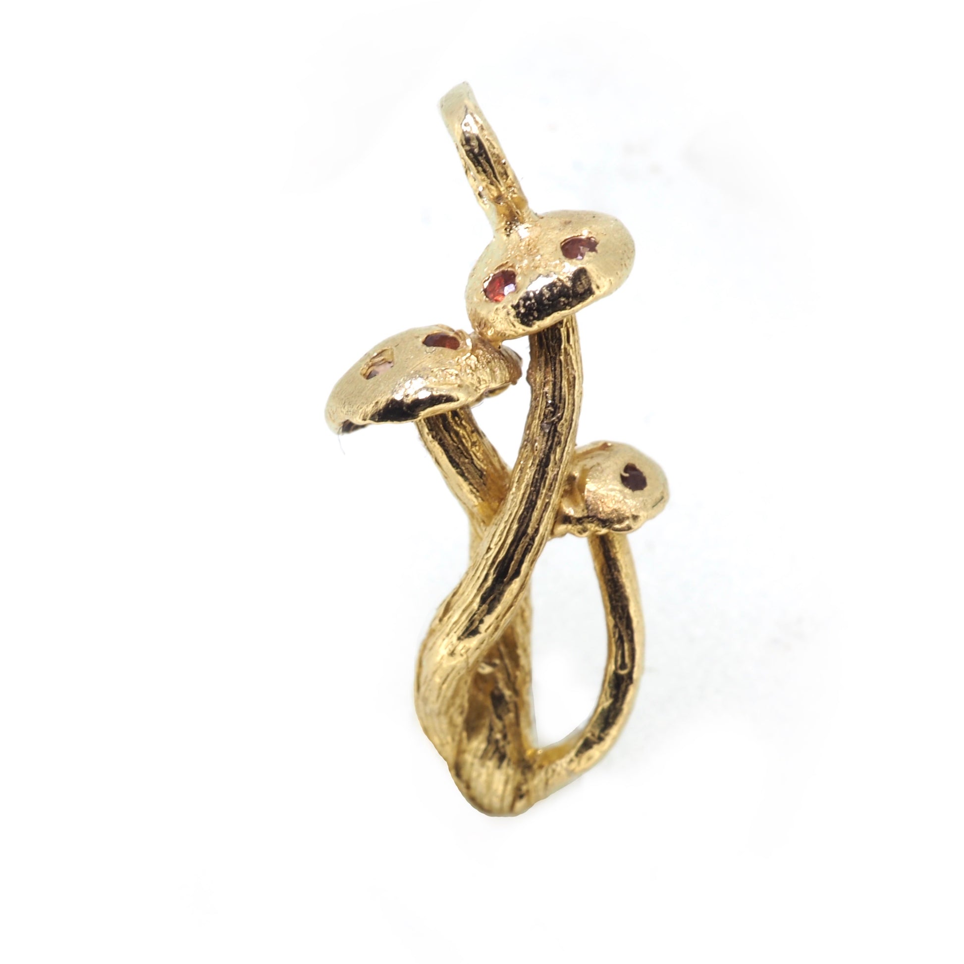 A trio of tiny mushrooms intertwined and cast in 14k gold.
