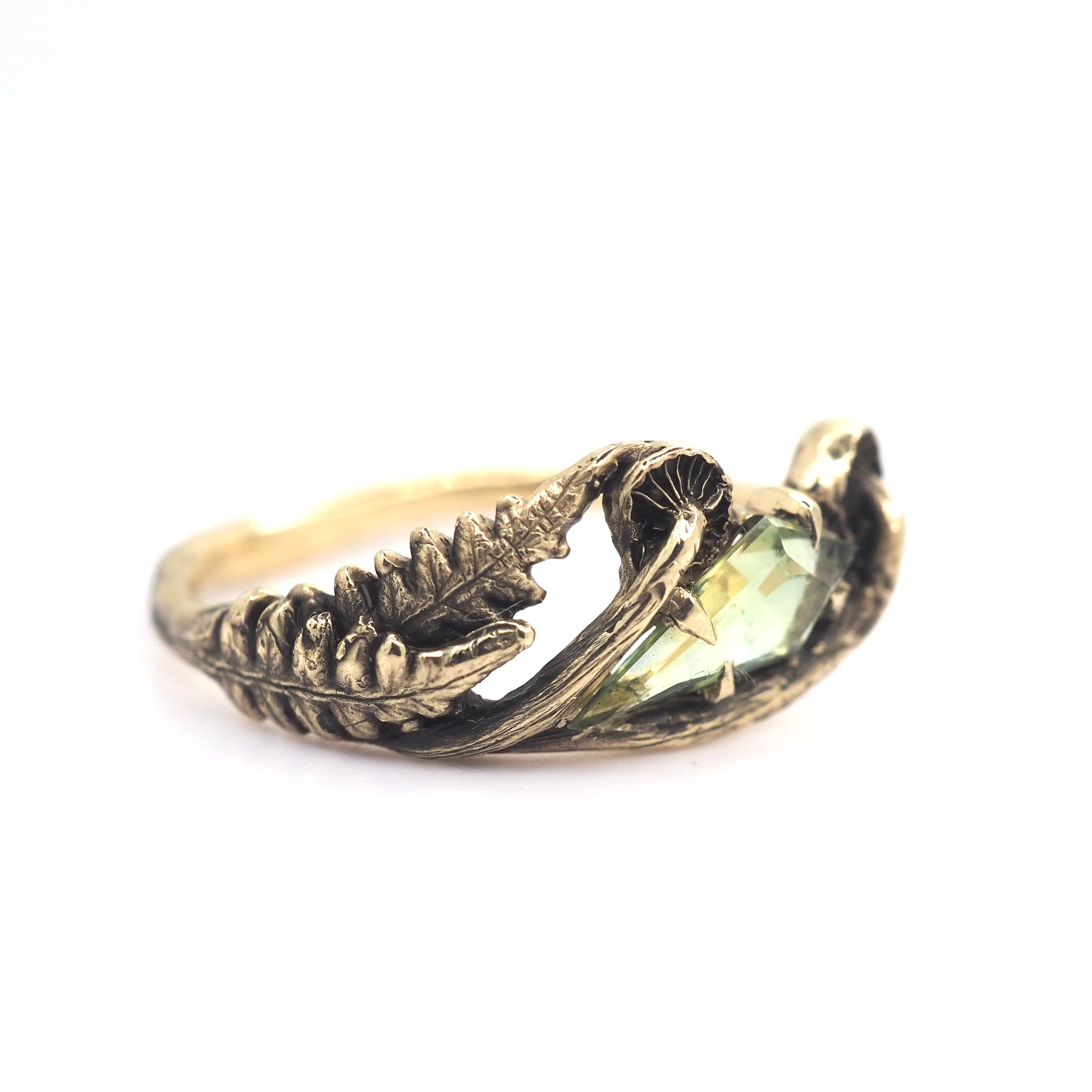 Twig and fern ring crafted from 14k yellow gold with tiny mushrooms and set with a kite shaped Australian sapphire.