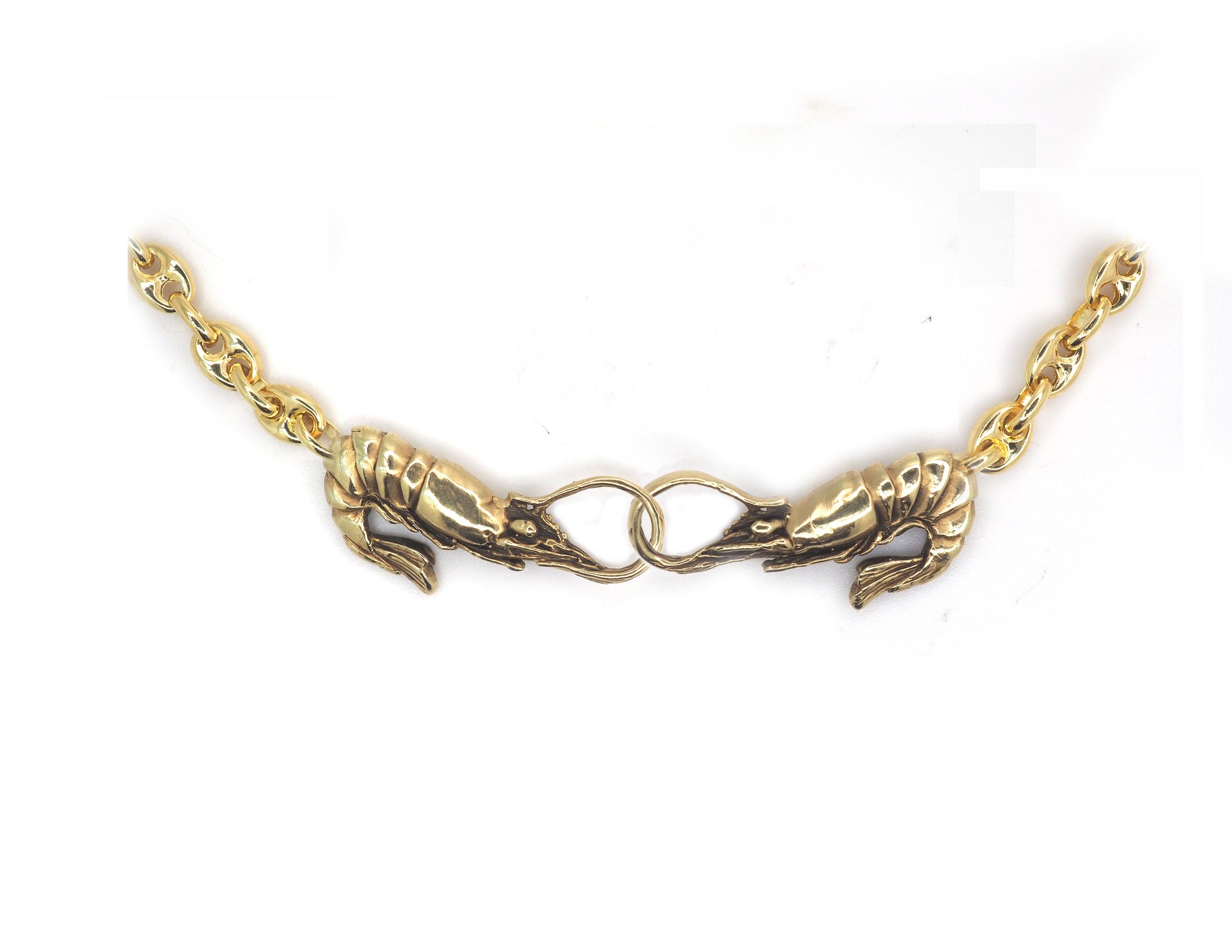 Two shrimp entwined in the center of this necklace. 18” solid 14k gold.