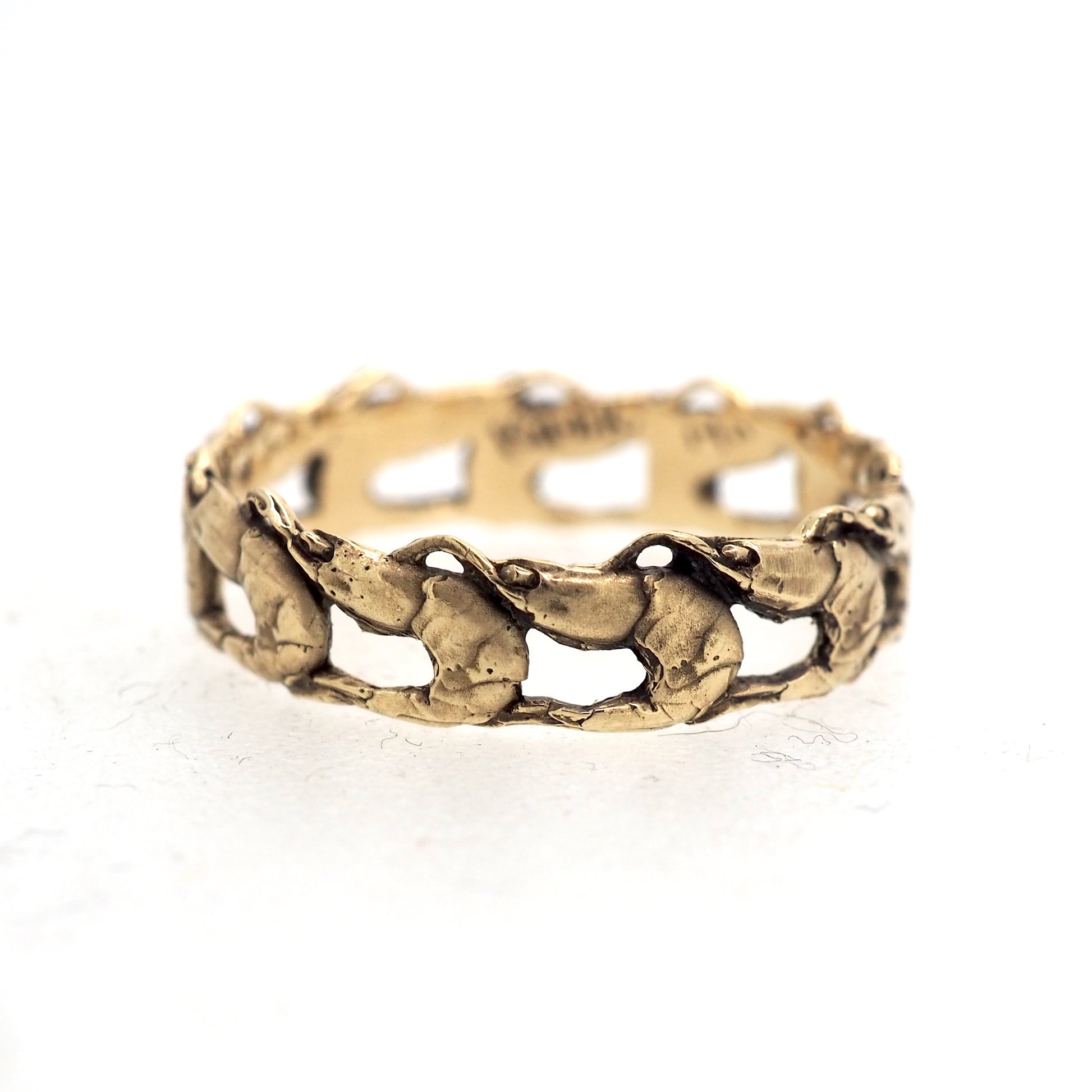 An infinite band of little shrimps for your fingers. Available in 14k rose or yellow gold. Made to order, please contact Kimi at kimikaplowitz@gmail.com to begin the order process. Other center stones are available. Made to order pieces may take up to 8 weeks to make and ship. However usually I can have your piece finished much sooner.