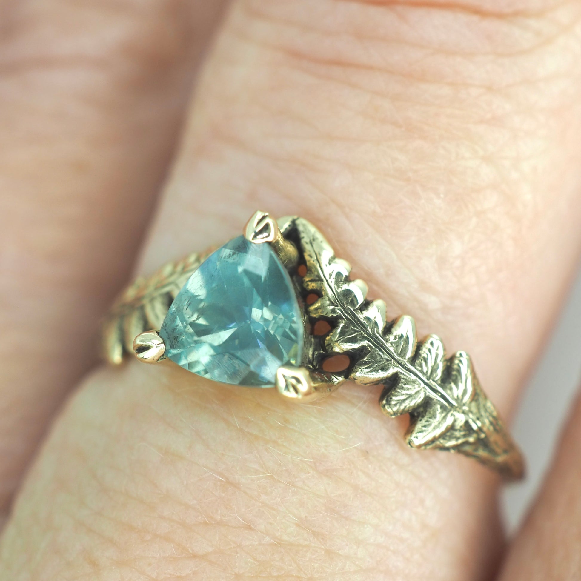 Chevron shaped ring with tiny ferns embracing a beautiful 1 ct trillion cut teal Malawi sapphire. Crafted from Fern fronds and twigs foraged in the Pacific Northwest and cast in 14 k yellow gold