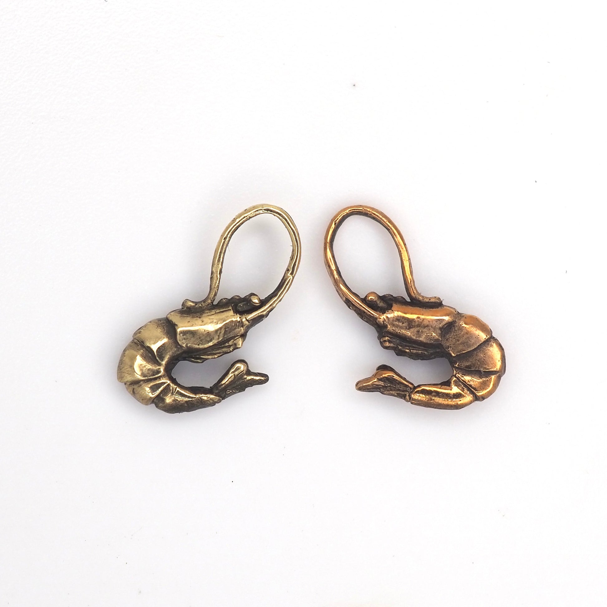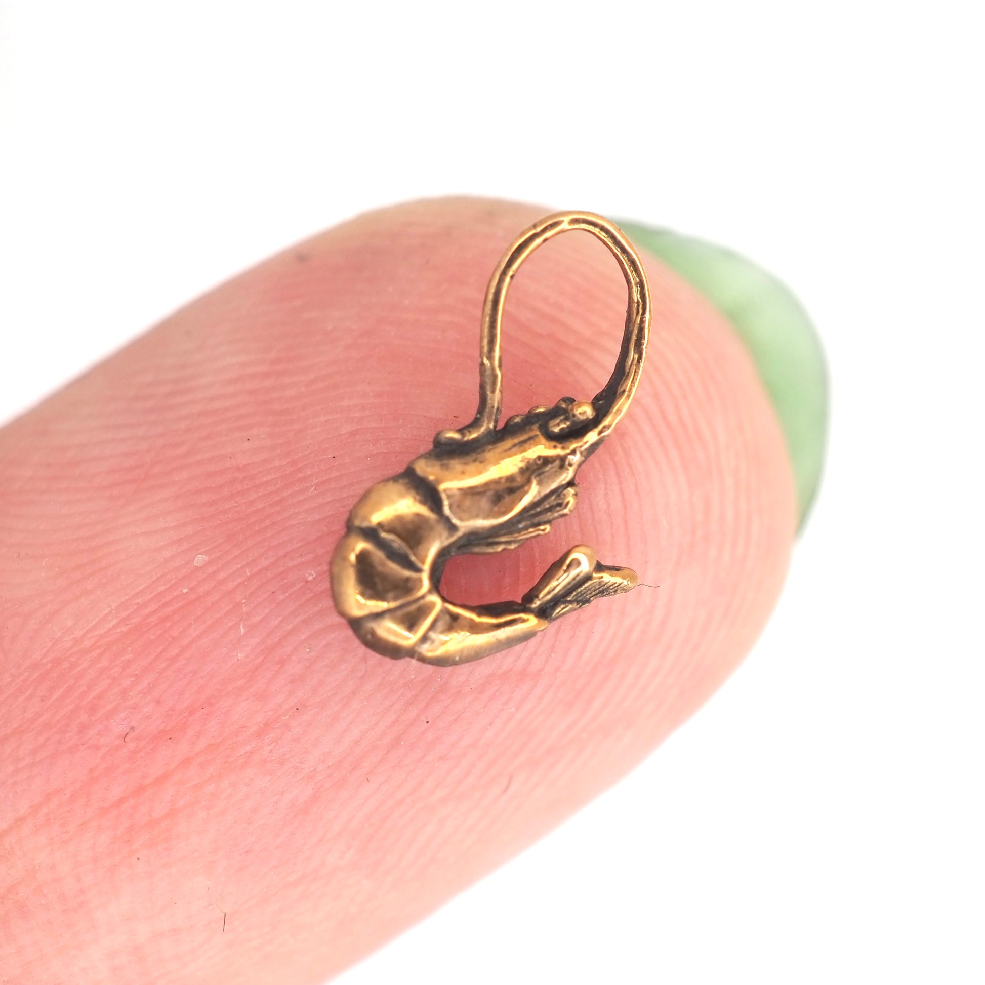 Tiny shrimp lifecast sculpted hybrid. Cast in 14k yellow or rose gold.