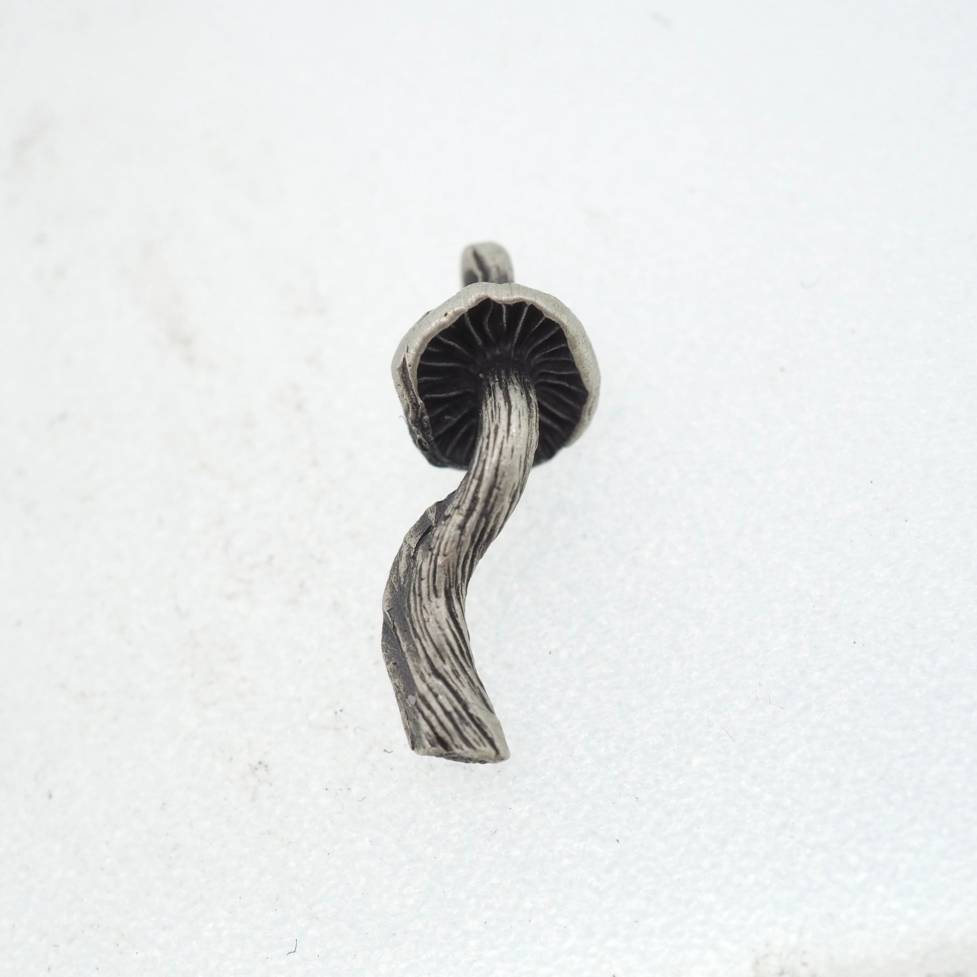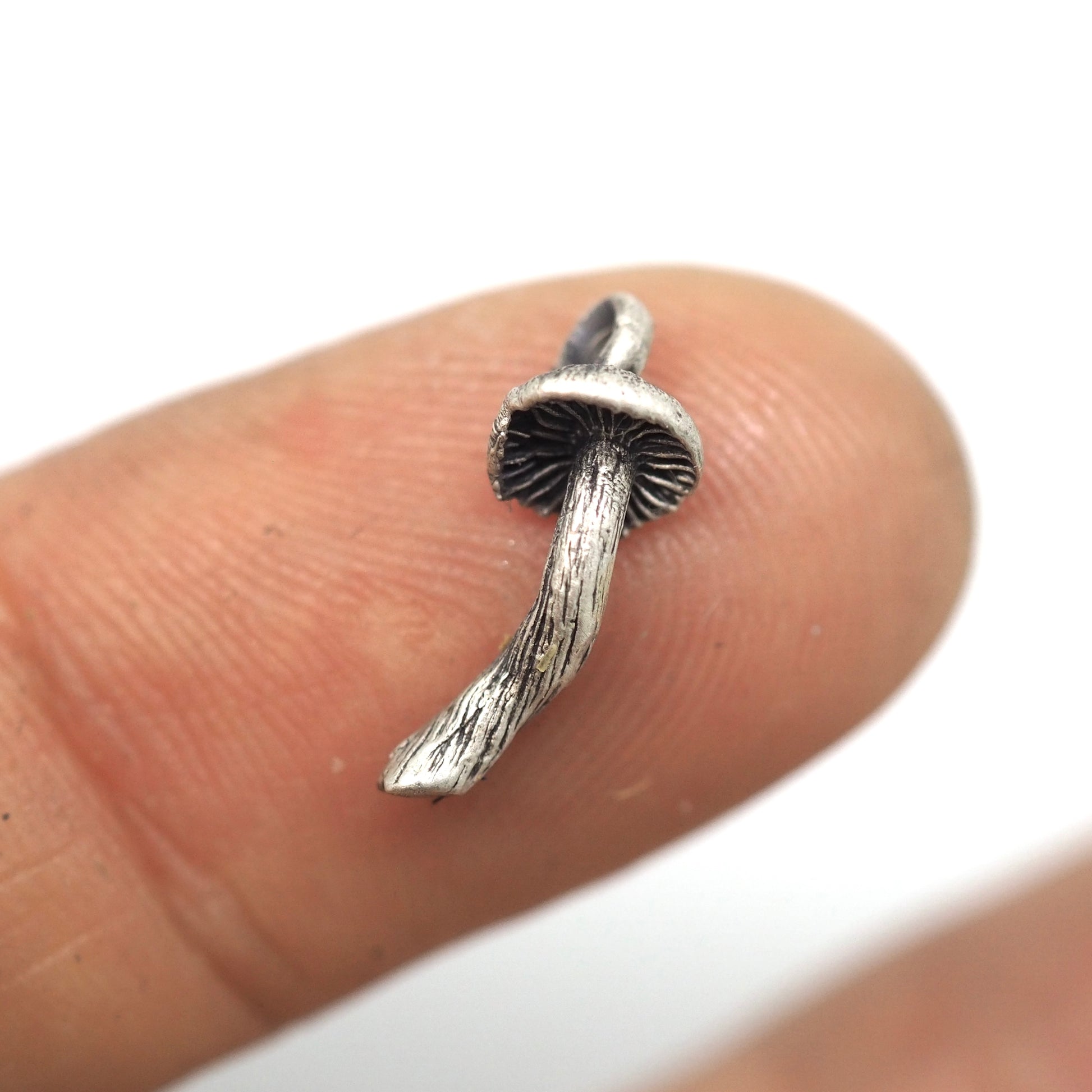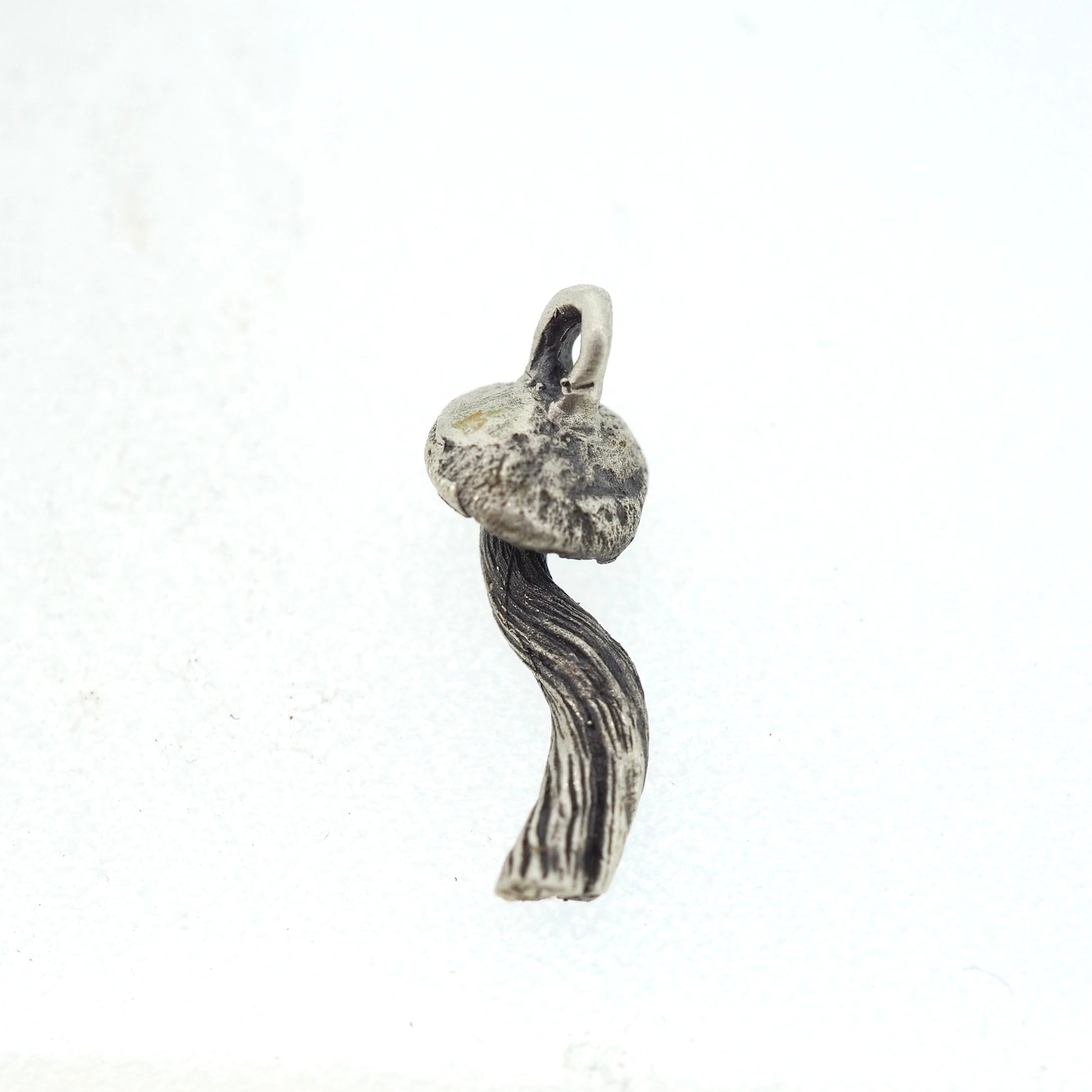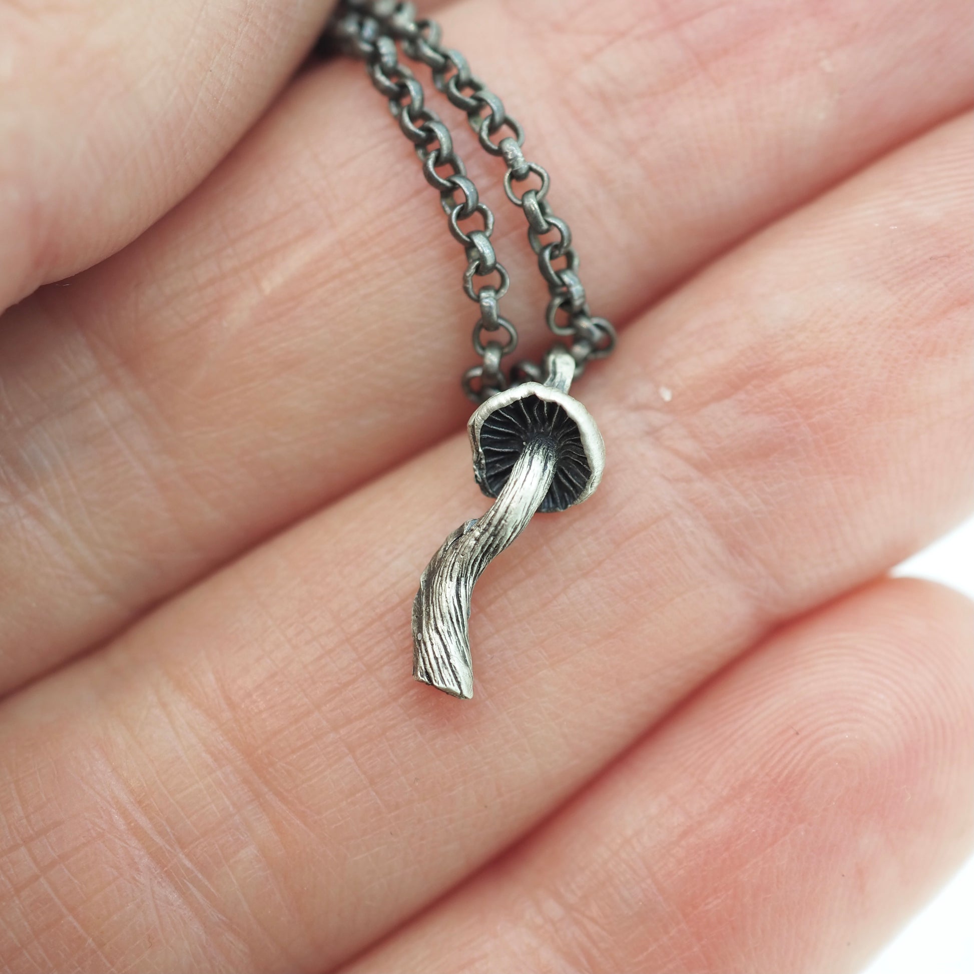 Tiny mushroom cast from a mushroom collected in the Pacific Northwest. 3/8” tall Hangs on a 20” sterling silver chain.